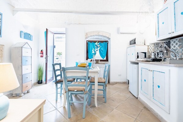 Inside Vico di Ostuni Suite, you will be welcomed by a bright and spacious living room, where there is a fully equipped kitchenette and a comfortable dining area. The house has two bedrooms: one with a double bed and another with a bunk bed, perfect for families or groups of friends. Complete the structure a modern and functional bathroom.