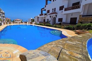 Spacious terrace, pool and access to the sea.