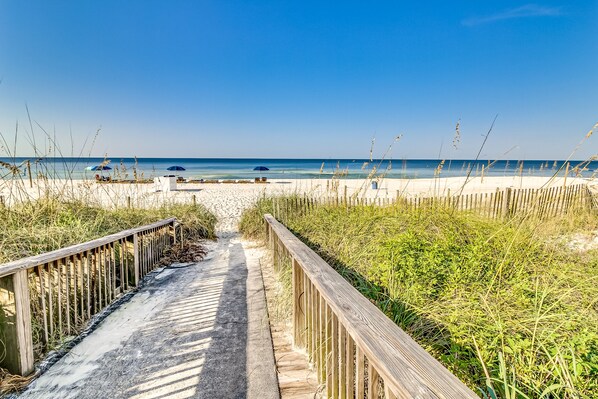 Central air-conditioning will keep everyone cool inside, and the private washer/dryer will take care of the beach towels while you relax. The full kitchen features full-size appliances and a dishwasher to help with easy cleanup.