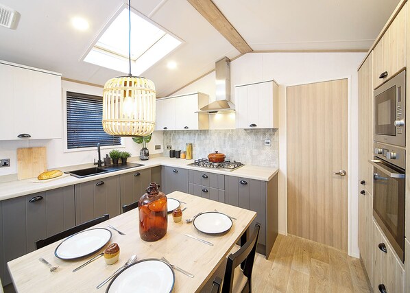 The spacious open-plan living, kitchen and dining area is finished in a warm colour palette and provides a comfortable setting for family time. The kitchen is well equipped with washing machine , fridge freezer, built-in oven and microwave.