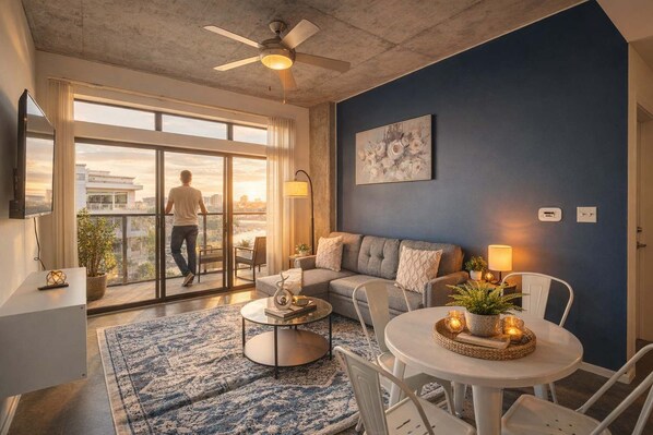 Unwind in the comfortable living area after a day of exploring the city or spending time with family and friends.