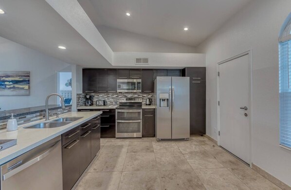 Pets stay for free! No cost to heat the pool! This gorgeous single story remodeled home features 3 bedrooms, 2 baths, a fully equipped modern kitchen, stainless appliances & quartz countertops, travertine floors and vaulted ceilings. You can kick back and enjoy the beautiful ARIZONA sun in the resort style backyard that includes a heated pool, decorative lighting, lots of greenery and a covered patio that is great for entertaining your family. We support equality!