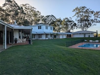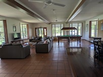 The house comes with four beds, a dining area, kitchen, living room, a saltwater pool, and even a billiards table.