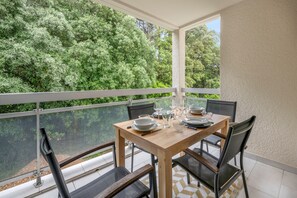 Waterfront apartment with kitchen and patio