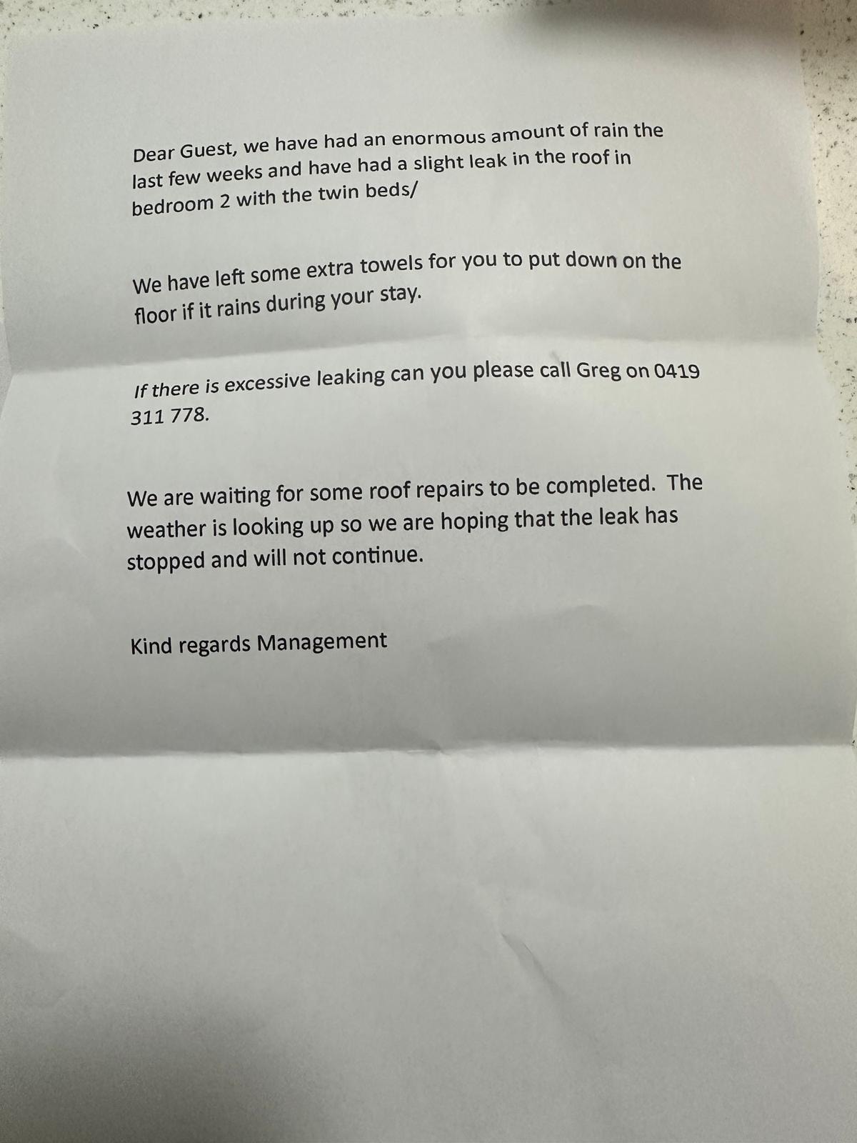 We were informed of a water leak in the kids bedrooms upon checkin via a letter.