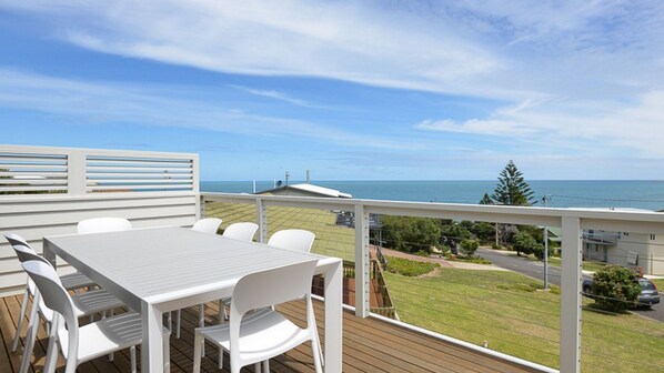 The main bedroom is located upstairs with a king size bed, ceiling fan and walk-in robe. Ensuite with shower, vanity and toilet. Private access to the top deck for peace and quiet and what a view!