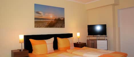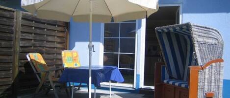 The 40m² large Non smoking apartment (1st floor) is suitable for three persons (double bed and single bed in the bedroom). Further facilities include a bathroom with shower / WC, a kitchenette (with fridge, microwave, two burners, coffee maker, toaster, kettle, dishes, etc.), a living room with TV and radio + CD player. Sheets and towels are included. A cot is available free on request (in addition only with an occupancy of 2 people). The apartment has a terrace with garden furniture. In the house a sauna and solarium for a fee. The small gym is free of charge. Cot and high chair are available.