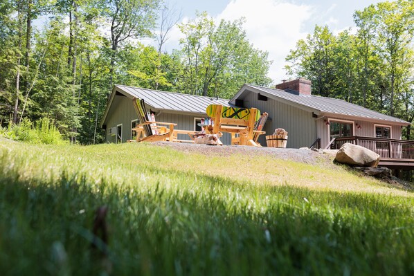 Escape to the heart of Vermont's Quechee Lakes Country Club, where our home offers a private retreat within this hidden gem. Spacious and fully-equipped, it features an open concept living area with a brick wood burning fireplace and wraparound deck. With access to golf, tennis, indoor and outdoor swimming at the nearby club house or enjoy your own ski-themed patio with fire pit.