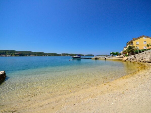 Supetarska Draga 7 km from Rab: 3-family house "Katica". In a sunny, elevated position, 100 m from the sea, 100 m from the beach. For shared use: property 1'000 m2 (fenced). Terrace (30 m2), garden furniture, barbecue. In the house: internet access, washing machine (extra) (for shared use). Parking at the house on the premises. Shop 700 m, restaurant 400 m, bus stop 4.4 km, sandy beach 5 km pebble beach 100 m (small). Marina 700 m. Please note: private mooring (extra) on request.