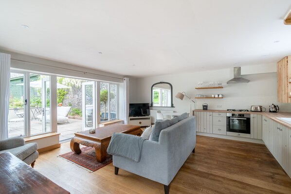 Our main open-plan living space has wooden floors, antique furniture, and a reclaimed wood country kitchen, with polished wood work surfaces and all the appliances that you would expect from a home of this quality, including a hob, Miele fan oven, dishwasher, nespresso coffee maker, microwave and washing machine. Our walls are decorated with some of our original art collection.