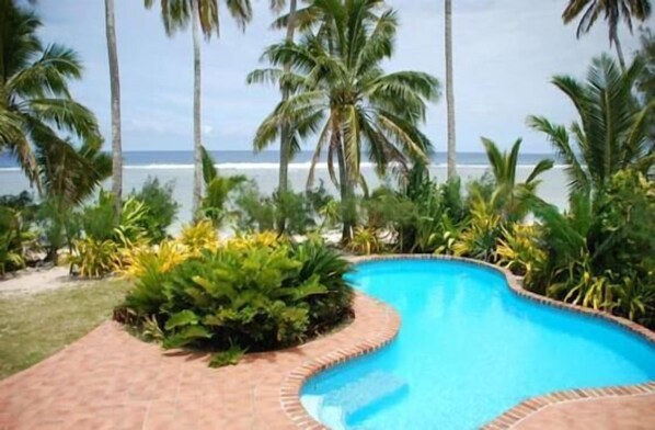 From the verandah you step down to the cool and refreshing swimming pool [there is a gate at the top of the steps for those little ones] and the white sandy beach and blue lagoon is ten metres beyond that. There are also a number of sun loungers around the pool to soak up the sun.