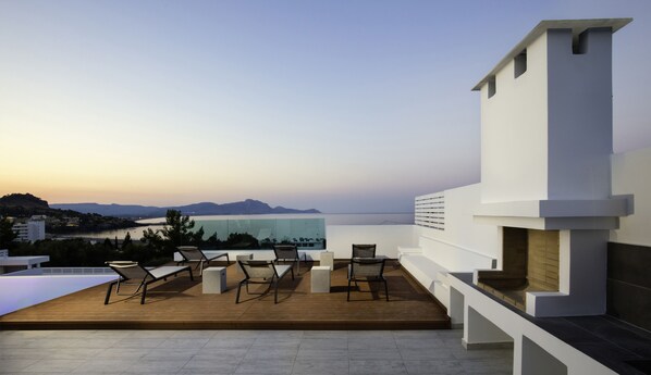 The main terrace is furnished with chaise longues and a large dining table with seats for sharing memorable moments.