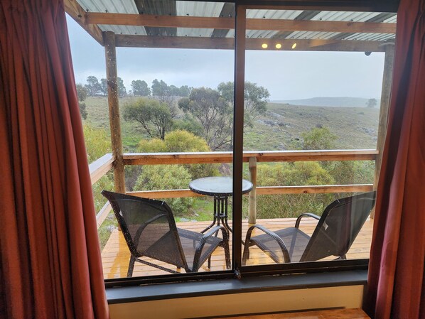 The open bedroom, boasting scenic hill and valley views from the bed, is the perfect place to relax and admire nature. It features a queen size bed, bedside tables with lamps, blanket box, gentleman's wardrobe and relaxing chair (for further admiring of the view).