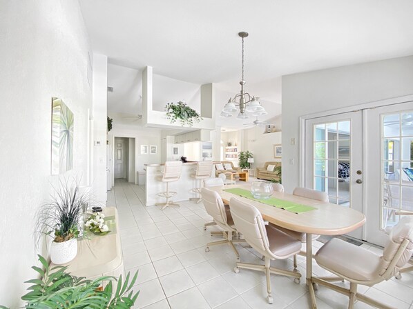 The large open concept living area has 3 sofas that seast 9, a 55” smart HD TV , a formal dining area that seats 8 You can extend your living space out via the sliding glass doors to the large, screened lanai and pool area; soon to be your favorite room!
