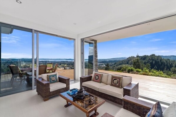 Expansive exotic timber decks allow visitors to relax on outdoor furniture scattered around the house. And as the sun sets watch the city come to life with it's dazzling display of lights.