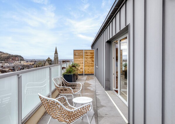 The 45 m² apartment has been designed to be as pleasant to live in as it is to discover: a functional entrance hall, a beautiful kitchen opening onto the living room, fully equipped (fridge/freezer, dishwasher, washing machine, oven, microwave, hob, kettle, toaster, Nespresso machine, complete set of crockery, etc.), a cosy lounge area to relax in after a day in the city, and an elegant bedroom with a high-quality double bed (160x200cm), which also opens onto the terrace. The sofa in the living room is convertible (140x190cm) and can accommodate two additional people (bed linen available at an additional cost of €12 on request, to avoid unnecessary extra costs if you do not need it). The modern and comfortable shower room has a large shower, a vanity unit, a towel dryer and a toilet.
