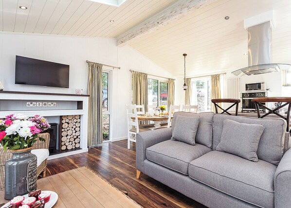 Spacious lodge with one king-size four poster and one double both with stylish en suite shower and two twin. Large bathroom with bath and overhead shower. Contemporary open-plan living space including solid wood floors and a rustic electric woodburner in the lounge, modern kitchen, breakfast bar and spacious dining area. Patio doors leading to a spacious decking area perfect for al fresco dining with outdoor hot tub. Ideal for a relaxing break with large families or large groups. Pets allowed in selected accommodation only.