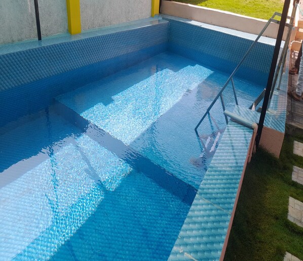 Travelers find a peaceful retreat with a refreshing outdoor pool and garden oasis, perfect for relaxing between flights with reliable internet connectivity