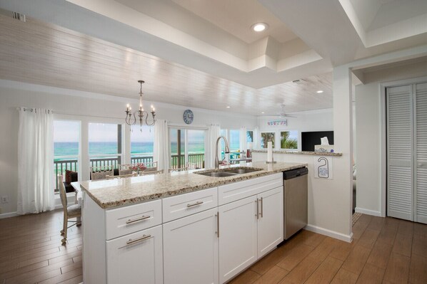 The living room and dining room are beachfront and have large windows that allow views to be seen from the fully stocked kitchen, so everyone can enjoy the beautiful beach views at all times. A new dining table seats 8 to 10 comfortably and with additional seating for 4 at the counter. The spacious kitchen features new cabinets with fresh hardware and plenty of cooking and serving essentials.