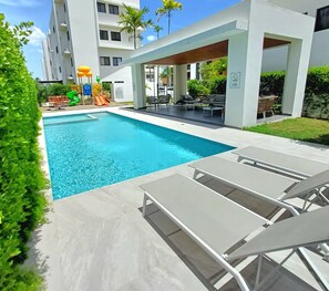 Elegant 3-bed apartment with AC, Pool Near the Airport