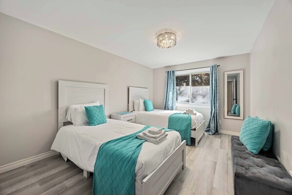 Upstairs, you’ll find three generous bedrooms, each designed with comfort and relaxation in mind. The primary bedroom features a queen bed, soft linens, and a remote-controlled ceiling fan and light for your comfort. The second bedroom has two single beds, perfect for siblings or friends, with a large window that welcomes in the morning sunshine. The third bedroom also offers a queen bed with a remote-operated fan and light, creating another cozy retreat for restful nights.