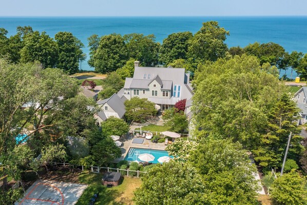 Enjoy lake views on the screened-in porch or enjoy your morning coffee on the all seasoned porch. Grill out on the propane grill, plenty of outdoor eating space is located on the patio. Located behind the home are a large pool and a hot tub. This backyard offers plenty of room for everyone to enjoy. The expansive backyard consists of half basketball court, soccer net, sand volleyball court, putting green, gazebo, and fire pit. There is also a bike garage available for guests to use. Across the street from the home, you will find stairs that lead to your private lake access to Lake Michigan. On top of the staircase find two Adirondack chairs to watch beautiful sunsets over Lake Michigan. Paradise is found both in and outside of the home.