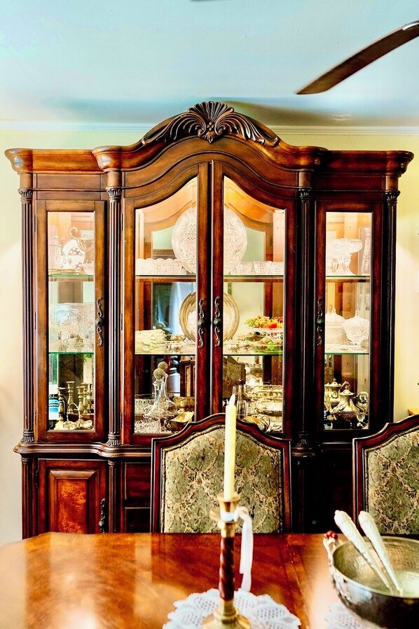 This home is fully furnished with pretty much everything a person would need to feel comfortable right away. There are lots of face clothes, towels, toiletries, toilet paper, several sets of bedding and duvet covers, bath robes, lots of hangers, and truly comfy comfortable beds. The dining room is loaded with plates and bowls, silverware, China, large serving plates, large serving bowls, loads of wine glasses, beer mugs in the freezer, cutlery for every occasion, and lots of fun doo dadas for decorative table settings. The pantry is packed with baking pans, pots and pans, air friers, an Italian tweedy bird expresso pot, lots of baking trays, toasters, fondu pots, and on and on. Also, the pantry has basic supplies, flour, sugar, coffee, tea, honey, and more to get your stay started. The kitchen as well it equipped lots of plates, bowls, glasses, and coffee cups. You won't need to buy anything to make the house more suited to your needs, it's all there.