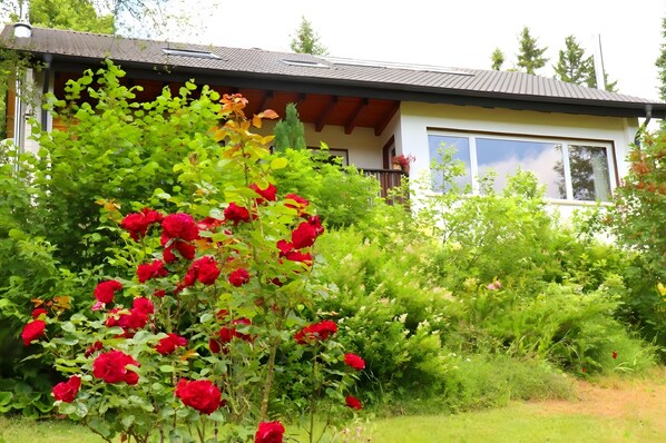 The Jachmann vacation apartment has a total area of 80 square meters, with two bedrooms for 2 or 2-3 people each (an extra crib is available, beds made up with fitted sheets, towels and hairdryer are included). Each bedroom has its own bathroom with shower/WC. In the living room there is a sofa bed, which offers an additional sleeping place for one person and a TV, which can be received via W-Lan with HDMI cable or satellite. From the living room you can access the sun terrace and sunbathing lawn, which offers a wonderful panoramic view. The apartment also has a kitchen with dining area, dishwasher, toaster and coffee machine. There is also a washing machine and an additional storage room. The beds are made up with fitted sheets, please bring your own bed linen. Bed linen can also be rented for an extra charge of 10 euros per person. Towels are included in the price.