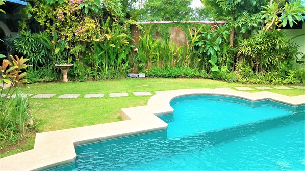 The villa consist of 3 privately separated bed rooms (the two separated by pool and garden, and the third up stair) with all 2 meters king size beds and one single in main bed room. 3 open air bath rooms, big pool, tropical garden with many Balinese Hindu statues, kitchen, dining table and a DOME shape open air living area. Bikes, wify and tv cable are all available free. Linen, bed sheets, bath and pool towels, shampoo, soap, gallon drinking water are provided. All bed rooms are fully air condition and fans.