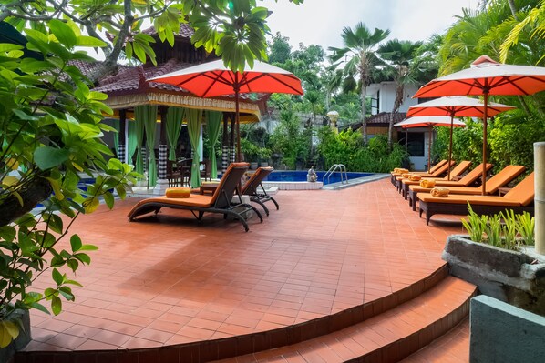 Travelers enjoy poolside dining and relaxation with a good book at this serene retreat just minutes from Seminyak Square and Legian Beach