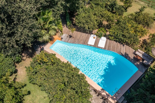 The house spans over 251 m² on a generous 10,000 m² plot, featuring 5 spacious double bedrooms and 5 bathrooms (including 2 en-suites), accommodating up to 8 guests comfortably. The light-filled interior boasts a warm and welcoming design with a large open-plan living area that combines a dining space and a fully equipped American kitchen. Air conditioning, central heating, and a cosy fireplace provide year-round comfort, while satellite TV and high-speed WiFi keep you connected during your stay. Outside, the extensive garden area with hanging hammocks, sun loungers, and a private pool (10m x 4m) invites you to relax and unwind. The property also includes a delightful outdoor barbecue area, perfect for enjoying meals alfresco amidst the tranquil surroundings.