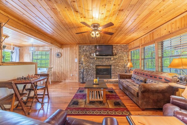 When you arrive at the cabin, you will find several convenient parking areas and a carport. The covered porch area has rocking chairs and a large swing, the perfect place to relax with morning coffee or unwind with a good book. The livng room features a stone gas fireplace, a flat screen TV, new wood floors, candle lights and comfortable furniture for relaxing together while watching a movie or sporting event. There is also a chess table with 2 chairs for those who enjoy a challenge. The nearby kitchen is fully with equipped with everything you need to prepare your favorite meals and has a dining table for 6.