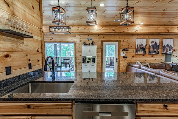 The fully equipped kitchen is a chef’s dream. Well-appointed with a full-sized refrigerator, dishwasher, stove, microwave, and other kitchen appliances perfect for making breakfast, lunch, or dinner throughout your stay! All pots, pans, glasses, plates, silverware, etc. are also there for you! Gather around the inviting dining table to share stories and laughter as it invites you to savor each bite while taking in the natural beauty of the surroundings. The kitchen counter offers extra seating, perfect for casual breakfasts or chatting while cooking.