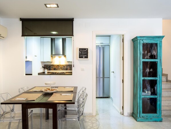 The apartment is located on the first floor of a building with 8 apartments. The house faces a quiet and bright modern patio. Our apartment is distributed over 3 floors connected by an internal staircase. On the access floor there is the living room, kitchen and dining room, on the second floor the master bedroom, the second bedroom and the bathroom, and on the third floor the third bedroom and the private terrace. This terrace is for the exclusive use of our guests. The third bedroom can be transformed into an office next to the private terrace to delight the Digital Nomads: work next to a private terrace with views of the Giralda de Sevilla.