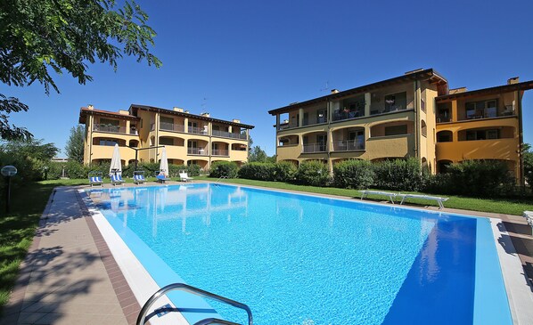 communal pool, garden with table and chairs, deckchairs, bicycles.
