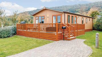 A lodge with a range of amenities, including open plan dining and living area. Free wi fi , bedding