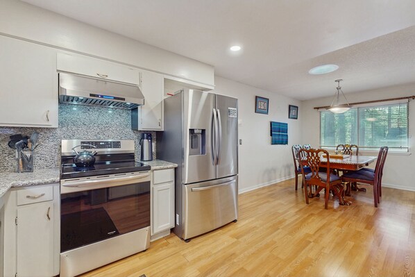 Inside, the home’s character shines in the sunken living room, complete with a rock fireplace, pellet stove and classic décor. You can spin vinyl records or play CDs as you relax by the fire. The fully modern kitchen offers everything a cook could need, including an induction range, air-fryer oven, dishwasher, and full cookware setup.