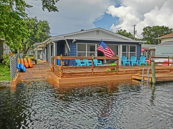 Inside, you’ll find 1,380 sq. ft. of thoughtfully updated living space with cozy coastal décor. The 200 sq. ft. Florida room is perfect for morning coffee, board games, or a breezy afternoon nap. Outside, enjoy over 400 sq. ft. of deck space to grill, lounge, and soak in the canal views—where manatees are frequent and unforgettable visitors.