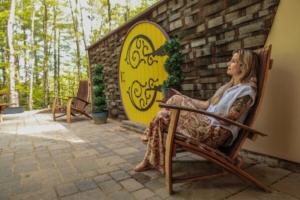Escape to The Shire, a unique earth home on 15 wooded acres. Unwind in the hot tub or gather around the fire ring on the outdoor patio with picnic table.