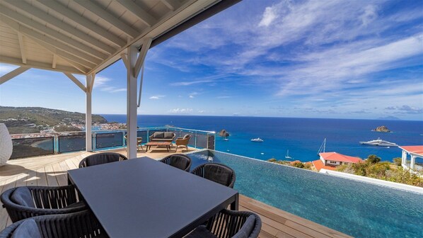 Perched on the heights of Colombier, Belharra in St. Barths offers a serene retreat with an ocean view from its spacious living room and sun-kissed terrace. Unwind by the infinity pool or lounge on the sunny deck chairs while taking in Gustavia and Colombier views.