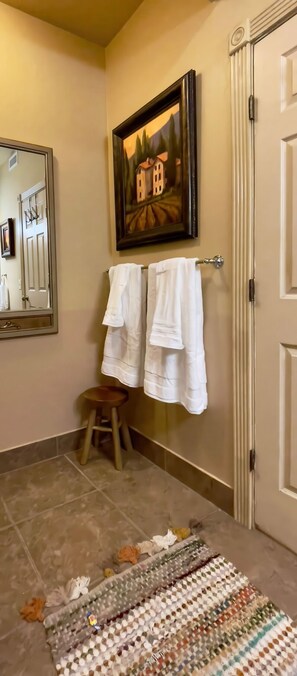 ◉ Shampoo, conditioner, body wash, hair dryer, towels