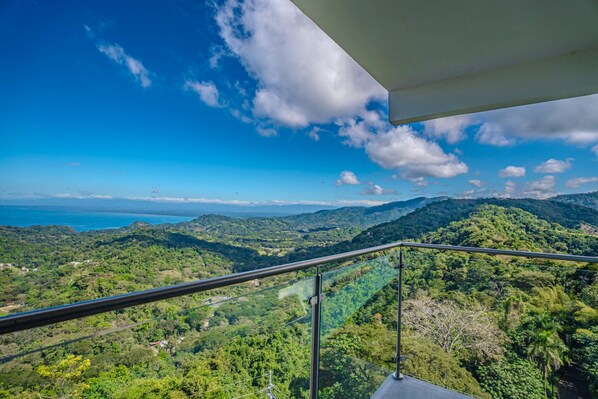 Sweeping views of the Nicoya Gulf, ocean, mountains, and Carara National Park—visible from the balcony, living area, kitchen, and all bedrooms, with sunrise and sunset vistas.