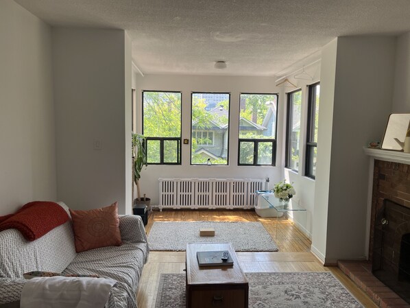 In a peaceful neighborhood surrounded by big trees, this calm apt is filled with natural light from every direction. Perfect for rest or work-from-home days, its serene ambiance invites relaxation and productivity.