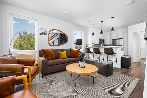 This brand-new 2-bedroom, 2-bathroom corner unit townhome is the perfect base to explore Downtown Traverse City and nearby Lake Michigan by foot. It comfortably sleeps up to 6 and boasts a private rooftop deck with city and water views. High-speed internet, a dedicated workspace, and modern amenities are included to make your stay convenient and memorable!