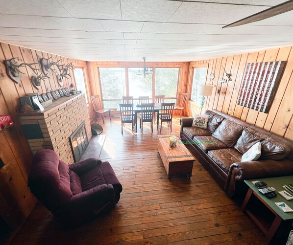 Walk into the open living/dining room area, with lovely hardwood floors and large windows with a view of the lake. Plenty of room for eating, curling up by the wood-burning fireplace, or watching a good movie. To the right, there are two bedrooms on the main floor. The first bedroom has a queen bed and a twin bed, and the second has a queen bed. To the left of the living room, there is a large full kitchen with a dishwasher. The kitchen includes a breakfast area. A full bathroom with a shower/tub combo is to the left of the kitchen at the top of the steps leading to the basement.