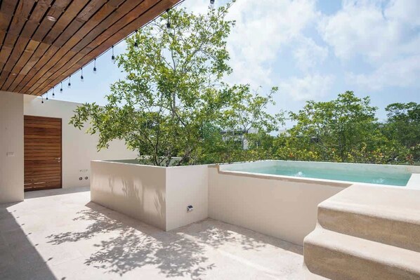 That’s not all! Ride the panoramic elevator, overlooking the jungle, to the upper floor where you’ll find our rooftop pool sunroof, pool bar, and spa facility, with gorgeous open views of Tulum and surrounding areas across the jungle horizon. Take a yoga class or meditate in a partitioned lounge.