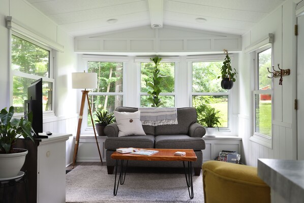 Nestled in the woods, The Bungalow offers a cozy retreat. Unwind amidst natural lighting and live plants, or watch wildlife from the dining room window. Cook up your favorite dinner in the kitchen or fire pit, then relax around a warm fire with plenty of wood provided.