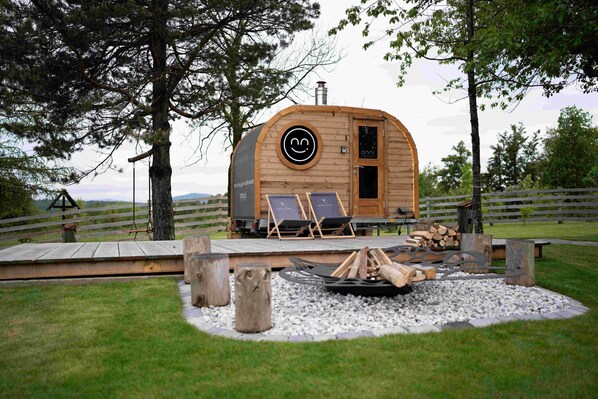 Nestled on a hill near a lush forest, Mobile Home with Terrace offers serene retreat amidst natural surroundings. Relax on the roofed terrace, complete with outdoor furniture and BBQ grill, perfect for picnics or enjoying nature views of Snežnik and Kamink Alps. Inside, unwind in the cozy bedroom or comfortable living room.