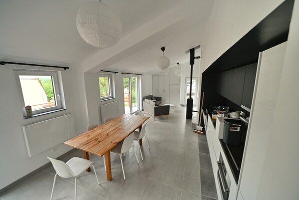 Layout: Ground floor: (open kitchen(dining table, cooker(ceramic), oven, combination microwave, dishwasher, fridge, freezer), Living/diningroom(TV(smart TV), stove(Pellet), seating area), bedroom(double bed)) On the 1st floor: (bedroom(double bed), Children's bedroom(bunk bed), bathroom(shower, toilet), bathroom(shower, toilet)) heating(electric), terrace, garden, garden furniture, parking, parasol