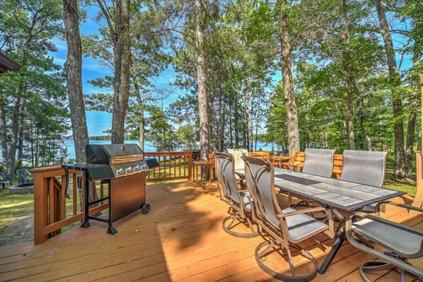 Outdoor Space: Large lakeside deck with patio furniture and gas grill, plus an expansive yard for lawn games or relaxation.